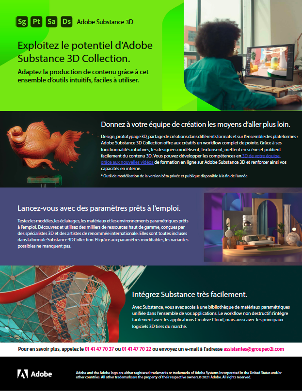 Adobe Substance 3D Collection offre aux créatifs un workflow complet de pointe. Vous pouvez développer les compétences en 3D de votre équipe grâce aux nouvelles vidéos de formation en ligne sur Adobe Substance 3D et renforcer ainsi vos capacités en interne.
